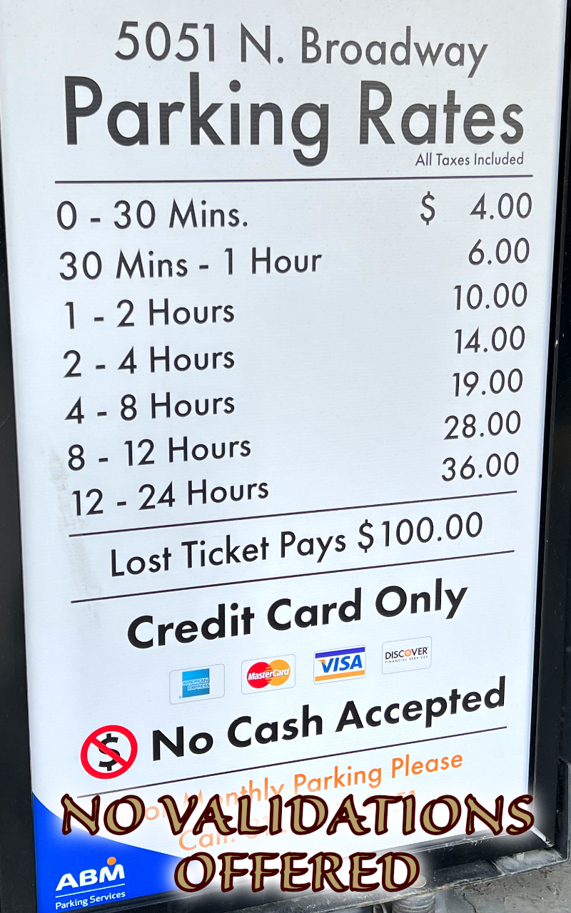 The 5051 N Broadway Parking Structure belongs to the tenants at the 5050 Flats building. Vast majority of the spaces at the 1st and 2nd level are RESERVED SPACES belonging to tenants. (Inconsiderate violators subject to towing) Spaces on level 3 and above have been made available to the public. Approach the entrance gate for your ticket. Take and safekeep that ticket. Elevator and stairway is located at the southwest corner of the building spilling out to Broadway street. Parking Validations are NOT AVAILABLE for this garage or any venue in the vicinity. Exit gate only accepts credit cards.